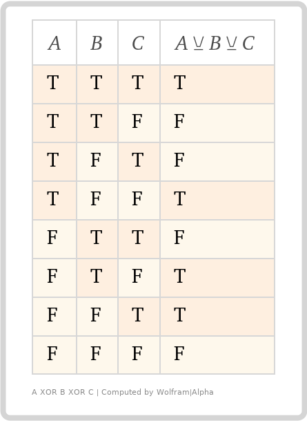 It looks MOSTLY correct, but notice, if all the assertions are true, the resulting assertion is also `true'! That's not what we want, but that is the mathematically correct result. So, we have to extend the logic definition to include "... AND NOT(A && B && C)". Our resulting truth table looks like this.
